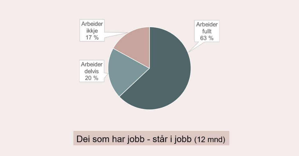 Nesten 60 % av deltakarane på AiR UNG har vore i arbeid i løpet av dei siste åra før oppstart. Av desse står 83 % i jobb etter 12 månader; 63% fullt og 20% delvis.